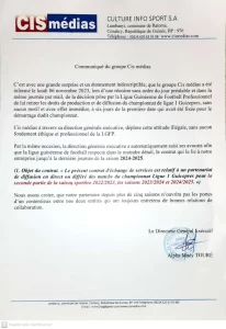Cette annonce est appréciée par les amateurs du football guinéen, mais pour la direction de CIS Médias c’est une violation du contrat signé entre et la LGFP. Elle l’a fait savoir à travers un communiqué publié sur sa page, elle compte poursuivre la Ligue Guinéenne de Football Professionnel.
