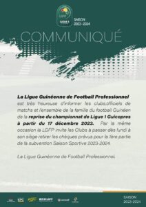 Dans le communiqué, les dirigeants des clubs concernés sont convoqués de passer dès le lundi 11 décembre au siège de Guinée.com pour le retrait des chèques pour la première tranche de la subvention de la saison sportive 2023-2024.