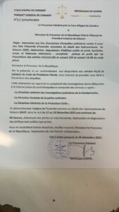Objet : Instruction aux fins d’ouverture d’enquêtes judiciaires contre X pour des faits Présumés d’incendie volontaire du dépôt des hydrocarbures de Kaloum (SGP), destruction, dégradation d’édifices public et privé, homicide, coups et blessures volontaires, complicité prévus et punis par les dispositions des articles 510,523,206 et suivant 239 et suivant 19-20 du code pénal.