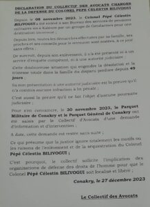 Le collectif des avocats du du colonel Pépé Célestin Bilivogui, l’officier enlevé à son bureau des services de pensions militaires à KALOUM par un groupe de gendarmes le 08 Novembre 2023. Il reste toujours sans traces , malgré toutes les démarches engagées par son pool d’avocat, elle reste sans suite. Les avocats pour sa défense exhorte l’implication des organisations de defense des droits de l’homme pour éclairer ce qiil qualifie d’enlèvement et sequestration de leur client.