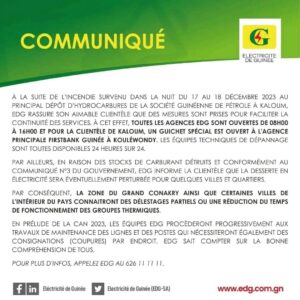 Incendie au dépôt d’hydrocarbures: des délestages partiels et réductions du temps d’électricité annoncé ( communiqué EDG)