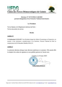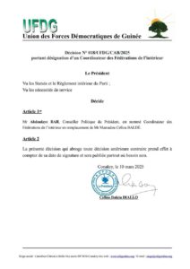 A travers une série de décisions rendues publiques ce lundi, 10 mars 2025, le bureau politique national de l’union des forces démocratiques de Guinée (UFDG) a procédé au remplacement de Mamadou Cellou Baldé et Mamadou Maladho aux postes qu’ils occupaient au sein du parti. Cette décision est consécutive à une rencontre que ces derniers ont eu avec le Président de la transition Général Mamadi Doumbouya au Palais Mohamed V.