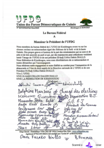 Nous membres du bureau fédéral de L’UFDG de Kissidougou avons vu sur les réseaux sociaux un mémorandum signé des fédéraux de la forêt et de la haute Guinée. Des propos graves et honteux de la part des missionnaires qui ne sont ni de près ni de loin associés au parti et qui, par des manœuvres peut orthodoxes voulaient ternir l’image de l’UFDG et de son président El-hadj Cellou Dalein DIALLO.