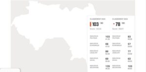 Contrairement à l’année dernière où elle était occupait la 78ème places, la Guinée a rétrogradé pour se trouver désormais à la 103e place avec un score de 52,53.
