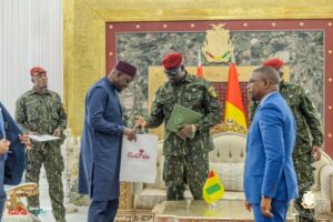 La délégation gouvernementale sénégalaise, composée de plusieurs ministres, a été introduite auprès du Chef de l’État par le Premier ministre et Chef du Gouvernement, Amadou Oury BAH, en présence du Ministre Secrétaire Général de la Présidence, le Général Amara CAMARA, et du Ministre Secrétaire général du Gouvernement, Bénoit KAMANO.