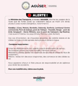 Le Ministère des Transports, à travers l’AGUISER, informe les usagers de la route que les fortes pluies qui s’abattent depuis ce matin ont rendu plusieurs axes routiers dangereux, notamment à