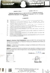 A travers un arrêté rendu public le 25 août dernier, le Journaliste Zézé Zoumanigui a bénéficié la confiance du nouveau ministre de la Pêche et de l’Economie Maritime, Fassou THEA en le nommant au poste de chef de service communication et relations publiques dudit département. Cette marque de confiance est le fruit de plusieurs années d’expériences acquises dans l’exercice du métier du journaliste. Directeur de publication du Journal la République et Directeur général de la Radio City FM, Zézé Zoumanigui est un journaliste professionnel aguerri qui a fait ses preuves dans plusieurs médias de la place pourra bien mériter ce poste. Il mettra son expertise en avant pour une meilleure visibilité du département de la pêche.