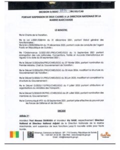 A travers un arrêté datant du 22 août 2025, le Ministre des transports, Ousmane Gaoual Diallo a suspendu deux cadres à la Direction nationale de la Marine marchande. Paul Moussa DIAWARA et Aly NABE, respectivement Directeur National et Directeur National Adjoint sont suspendus de leurs fonctions jusqu’à nouvelle ordre. Ils sont accusés de faute lourde. Aucune précision n’a été donnée quant à la nature exacte des fautes qui leur sont reprochées, ce qui suscite de nombreuses interrogations au sein du secteur maritime et au-delà.