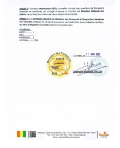 En attendant, Mamoudou KEITA, conseiller chargé des questions de Transports Terrestres et Maritimes, est chargé d’assurer la fonction de Directeur National par Intérim de la Direction Nationale de la Marine Marchande.