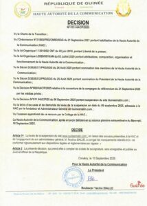A travers une décision rendue publique ce mercredi, 10 septembre 2025, la Haute autorité de la communication (HAC) a levé la suspension du site d’information Guinéematin.com. Cette décision de l’instance de régulation des médias intervient quelques jours avant après la suspension de ce médium pour manquement au principe d’impartialité durant la campagne référendaire et diffusion des contenus jugés partiaux et contraire aux obligations déontologiques imposées pendant cette campagne référendaire.