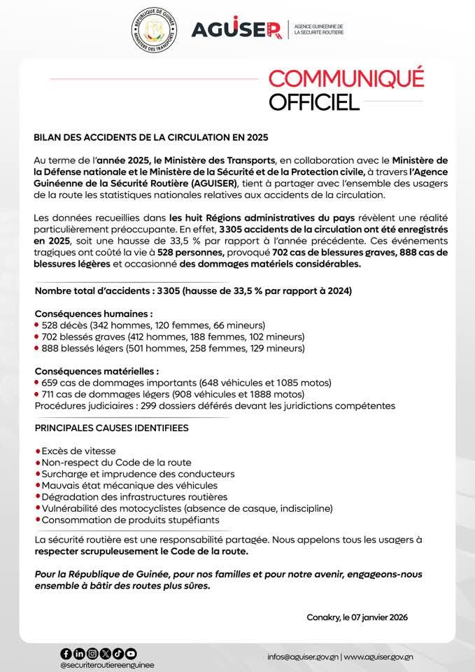 Le ministère des Transports, via l’Agence Guinéenne de la Sécurité Routière (AGUISER), a publié ce mercredi 7 janvier 2026 le bilan annuel de l’insécurité routière pour l’exercice précédent. Les chiffres révèlent une dégradation brutale de la situation sur les routes guinéennes.