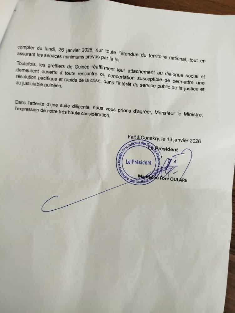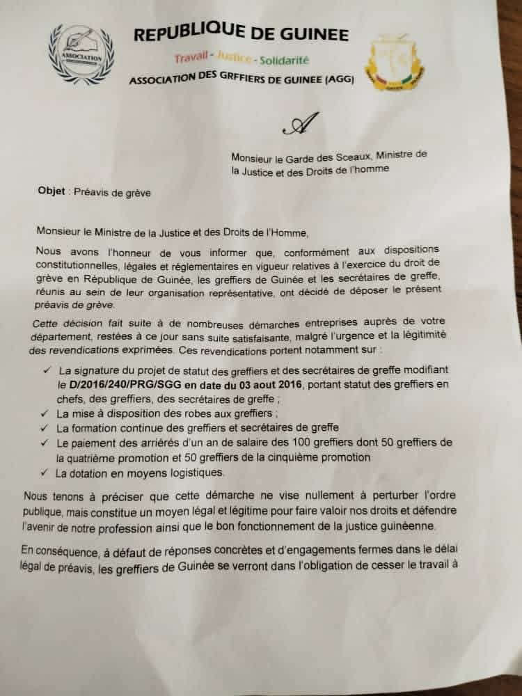 L’Association des Greffiers de Guinée (AGG) passe à l’offensive. Elle vient de déposer un préavis de grève adressé au Garde des Sceaux, ministre de la Justice et des Droits de l’Homme. Cette décision radicale fait suite à une série de démarches infructueuses auprès des autorités compétentes.