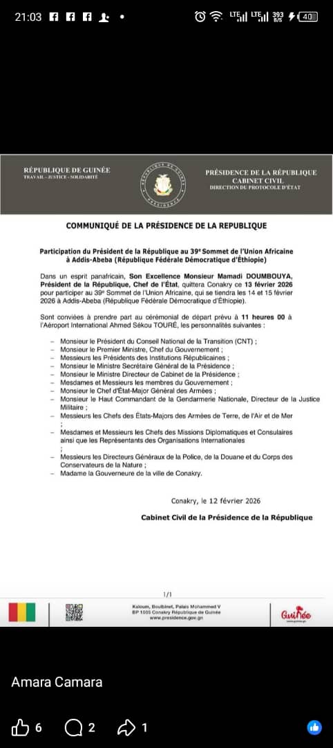 Le président de la République, Mamadi Doumbouya, s’envolera demain, vendredi 13 février 2026, pour Addis-Abeba (Éthiopie), afin de prendre part au 39e sommet de l’Union africaine (UA).