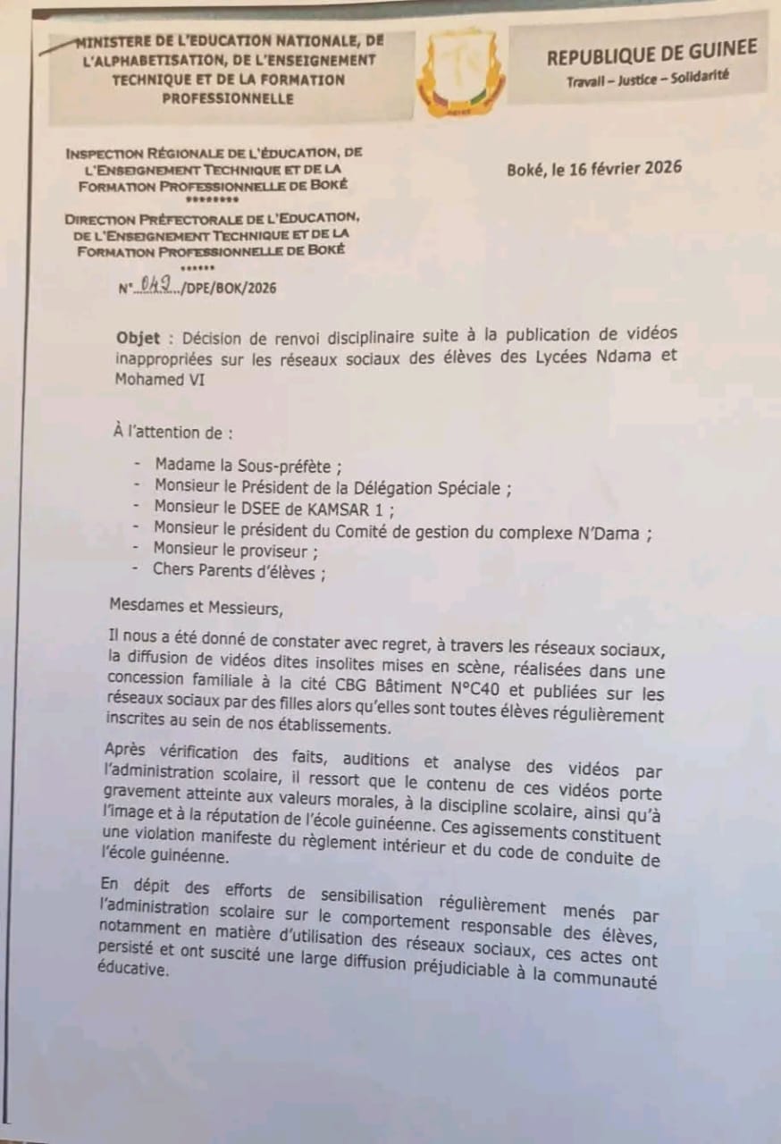 La Direction Préfectorale de l’Éducation (DPE) de Boké a annoncé des sanctions fermes à l’encontre de jeunes filles impliquées dans une vidéo compromettante devenue virale sur les réseaux sociaux. L’incident s’est produit dans la cité minière de Kamsar.