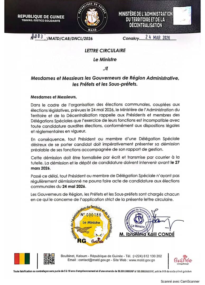 Par une lettre circulaire signée ce 24 mars, le ministre Ibrahima Kalil Condé a rappelé l’incompatibilité stricte entre les fonctions de membre d’une Délégation Spéciale et une candidature électorale, exigeant la démission préalable des intéressés accompagnée d’un rapport de gestion au plus tard le 27 mars 2026.