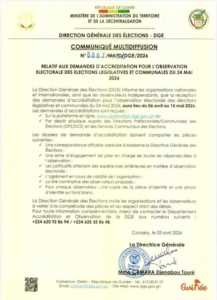 Les organisations et observateurs indépendants souhaitant suivre le scrutin sont invités à soumettre leurs dossiers du 06 avril au 15 mai 2026, soit via la plateforme numérique dédiée (www.observation.dge.gov.gn), soit par dépôt physique auprès des directions préfectorales et communales.