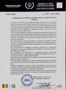 Dans un communiqué officiel, le Parquet général près la Cour d’appel de Conakry alerte sur la recrudescence des infractions sur les réseaux sociaux, notamment les injures, la diffamation et la diffusion de fausses informations. Face à ces dérives, le parquet annonce un renforcement des poursuites et appelle à un usage responsable de l’espace numérique, dans le respect de la loi et de la dignité humaine.