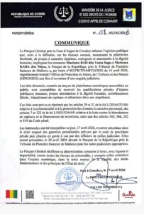 Le Parquet Général près la Cour d’Appel de Conakry informe l’opinion publique que, suite à la diffusion, sur les réseaux sociaux, notamment la plateforme facebook, de propos à caractère injurieux, outrageant et attentatoire à la dignité humaine, impliquant les nommées Mariama BAH dite Yama Sega et Mariama KABA dite Maya, le Parquet de la République près le Tribunal de Première Instance de Mafanco a, par lettre n°483/PR/TPI/MFCO/2026 du 14 avril 2026, régulièrement instruit l’Office de Protection du Genre, de l’Enfance et des Mœurs (OPROGEM) aux fins d’ouverture d’une enquête judiciaire.
