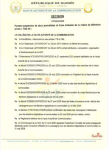 Dans une décision rendue publique ce jeudi 23 avril 2026, la Haute Autorité de la Communication (HAC) a annoncé la suspension de l’émission « Guinée Today » (diffusée sur la chaîne Télé 24) ainsi que de ses animateurs, notamment le Directeur général Aboubacar Diallo et Sékou Bah, pour une période de trois mois.
