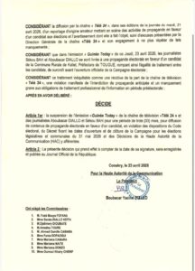 ​Cette sanction fait suite à la diffusion de contenus de propagande électorale en faveur d’un candidat, en violation directe des dispositions du Code électoral , du décret fixant les dates d’ouverture et de clôture de la campagne pour les élections législatives et communales du 31 mai 2026 et les décisions de la HAC relatives à la régulation de cette période électorale.